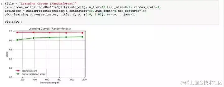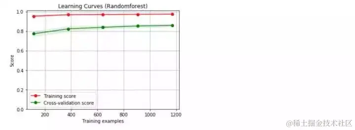 哇!好意外啊,这两个模型的结果表现都不错,但是随机森林的结果似乎更好,下面来看看学习曲线情况。\