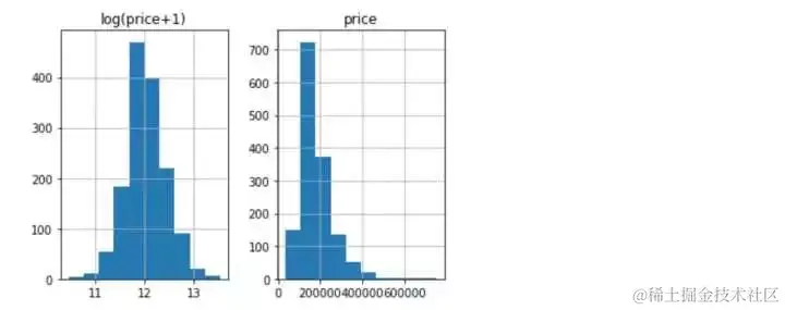 prices = pd.DataFrame({'price':y,'log(price+1)':np.log1p(y)})