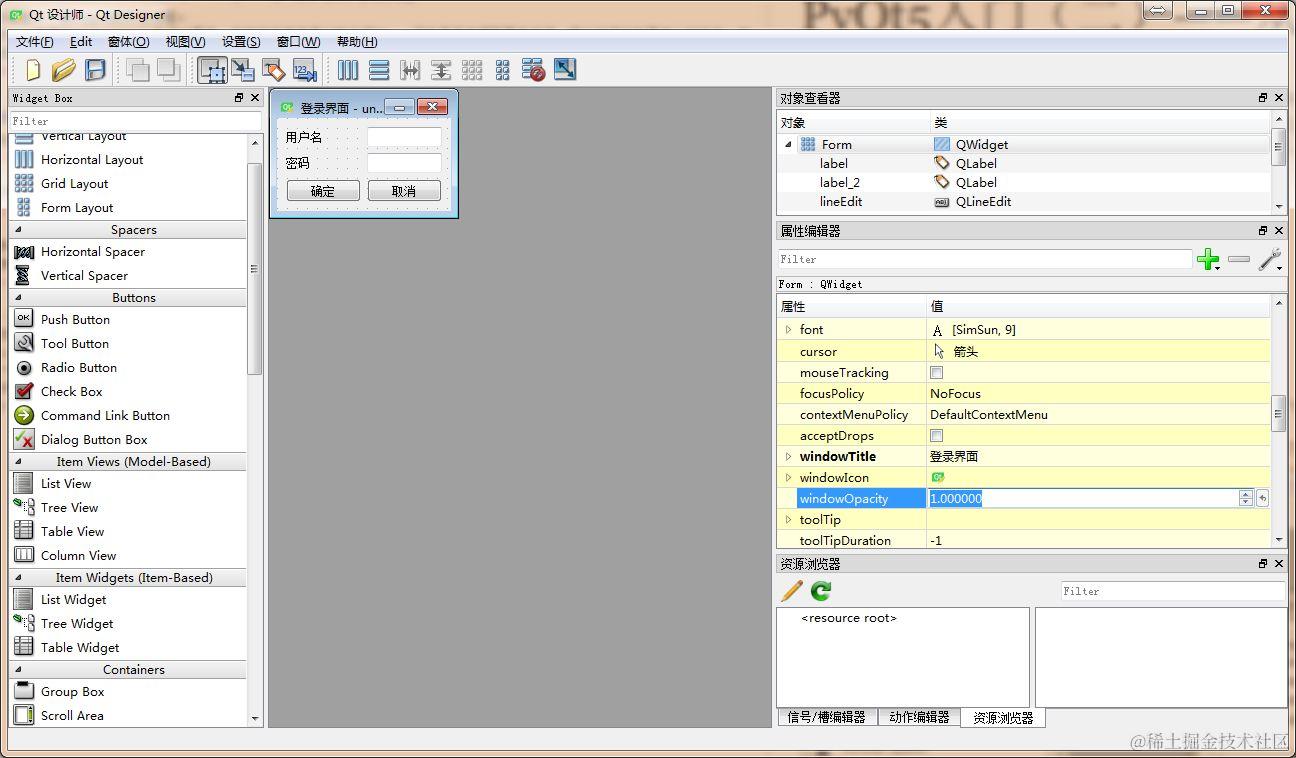 - 设置Form的“WindowTitle”为“登录界面”,