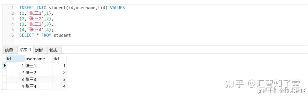 INSERT INTO student(id,username,tid) VALUES -- 同时插入多条数据(mysql独有) (1,'张三1',1), (2,'张三2',2), (3,'张三3',3), (4,'张三4',4);