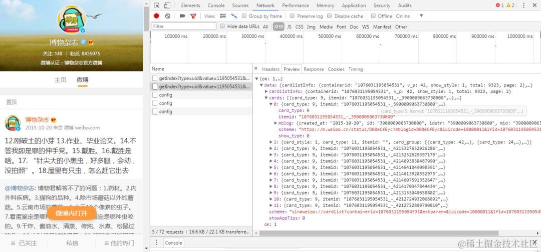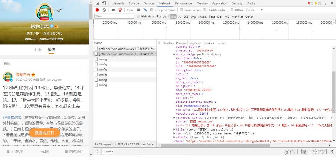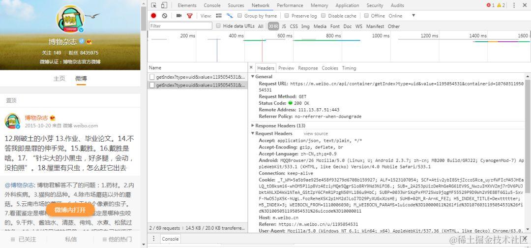 其中1195054531这段数字就是我们要找的uid,然后打开在浏览器中输入url: m.weibo.cn/u/1195054531 再次进入相同主页,这时候按F12打开谷歌开发者工具,点“Network”,因为移动端站点加载方式为异步加载,我们主要关注XHR下请求,点“XHR”,按F5刷新重新发送请求。这时候发现浏览器已经发送两个请求,第一个请求主要是为了获取一些和博主相关的介绍信息,而第二个请求就是为了获取第一页所有微博的信息,我们重点关注第二个请求。