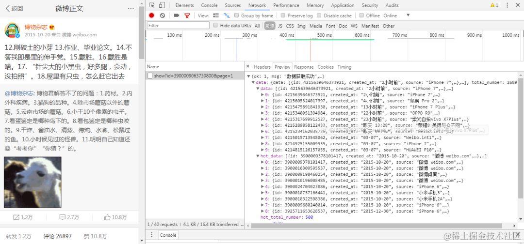 点开某条具体微博,来到微博完整内容和评论页面,同理通过观察“Network中请求相关信息,可以发现该页面url为: m.weibo.cn/api/comment… 其中id后面数字即为我们前面获取的微博编号,page参数可控制微博页数,请求返回json格式数据如下: