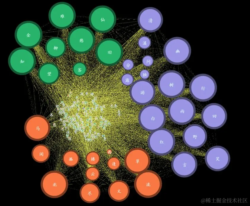 可以看到,上述的语义网络可以分为3个簇群,即橙系、紫系和绿系,TOP148高频字中,字体清晰可见字的近40个。圆圈的大小表示该字在语义网络中的影响力大小,也就是“Betweenness Centrality(中介核心性),”学术的说法是“两个非邻接的成员间的相互作用依赖于网络中的其他成员,特别是位于两成员之间路径上的那些成员,他们对这两个非邻接成员的相互作用具有某种控制和制约作用”。在诗句中,这些字常以“字眼”的形式呈现,也就是诗文中精要的字。3类中: