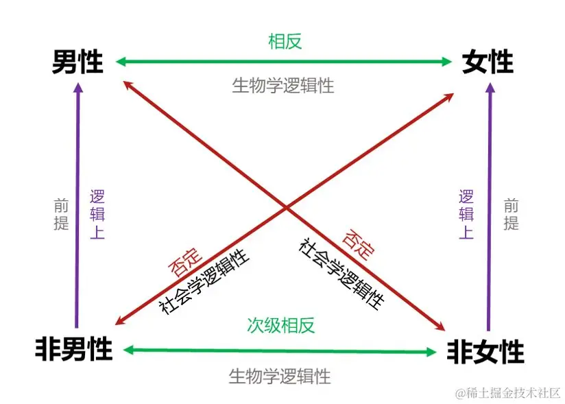 下面以“男性”和“女性”这两个相对的概念来举个例子,注意其中错综复杂的逻辑关系/类型。