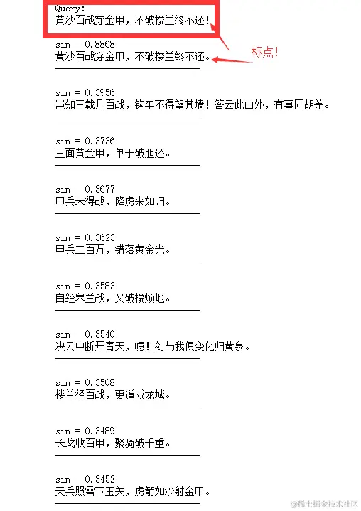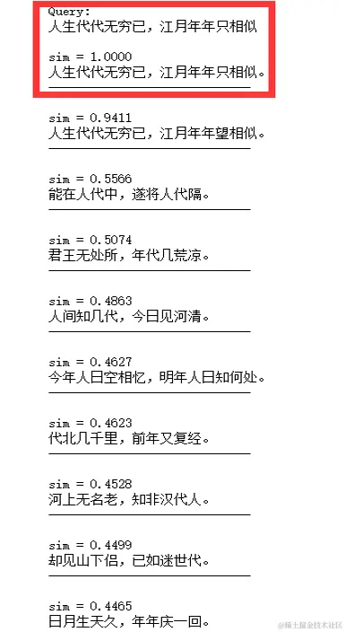 再看看笔者较为欣赏的2句名句,机器很好的捕捉到了它们之间的相似语义关系,即使词汇不尽相同,但仍能从语义上检索相似诗句。