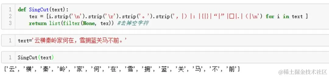 然而,对于古汉语(文言文),尤其是诗词的分词处理可没有这么简单,因为单字词占古汉语词汇统计信息的80%以上,再加上古汉语微言大义,字字千钧,所以针对现代汉语的分词技术往往不适用于它。鉴于此种情况,笔者采取的是逐字切分的处理方式,同时去掉一些常见的虚词,如“之”、“乎”、“者”、“也”。分词和去停用词处理如下所示: