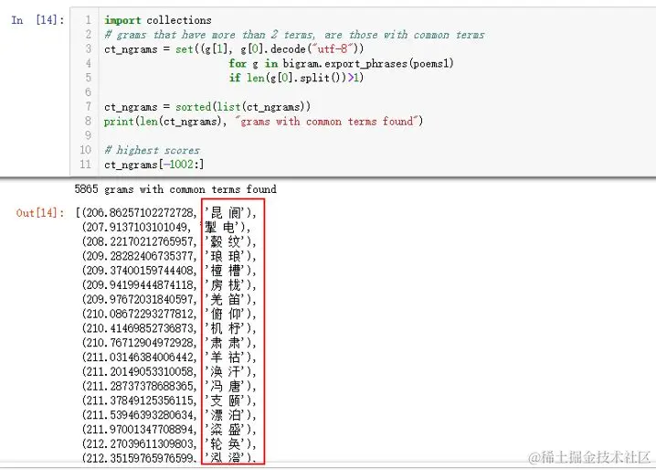 鉴于此,笔者想发现一些唐诗中的常用双字词,看看其中的成词规律是怎样的。笔者在这里选取共现次数超过10次的词汇,并列出TOP200的共现双字词。关键操作步骤如下所示: