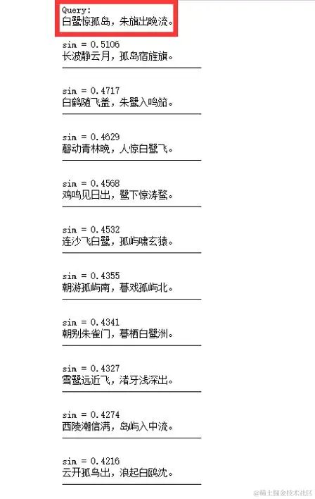 最后,我们来看看诗歌的信息检索问题,也就是笔者随意输入一句诗词,然后机器会按照语义相似度在《全唐诗》中检索出若干句符合要求的诗词。