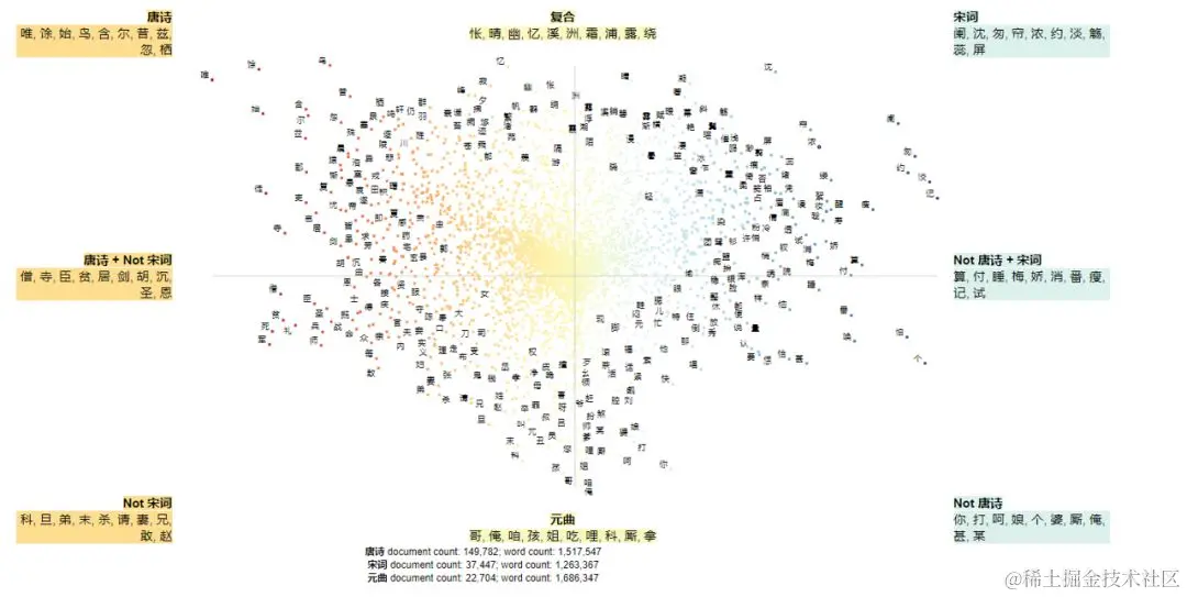 说完了分析的大致原理,笔者这里就来实战一番,与上述原始模型不同的是,笔者在这里除了基本的二元对立分析外,还新增了一个分析维度,总体是关于《全唐诗》、《全宋词》和《全元曲》的三元文本对比分析。
