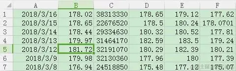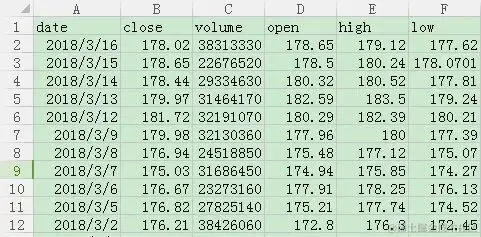 我们在我们python文件的同级目录下放置数据文件AAPL.csv,用excel文件可以打开看看里面是什么样的: