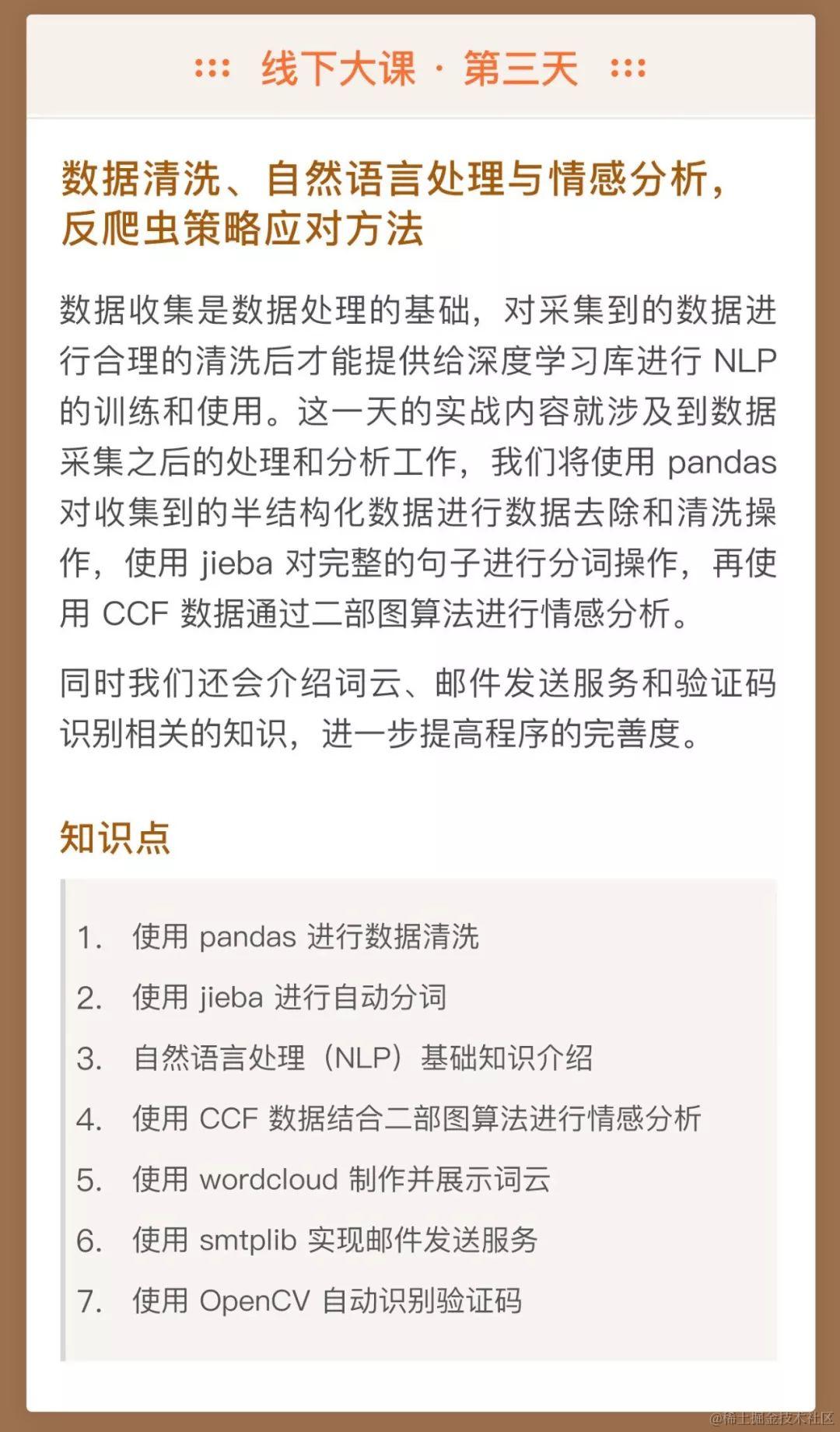 限量报名福利1. 原价 ¥3600 , 早鸟特惠 ¥2499,仅限 100 人 。我为大家争取了折扣,报名时输入口令: PYTHONZWQ ,可以 再优惠 200 元 。哦对了,除了 4 天线下大课 + 5 次直播 + 7周学习服务,所有线下大课及直播视频均可回看。
