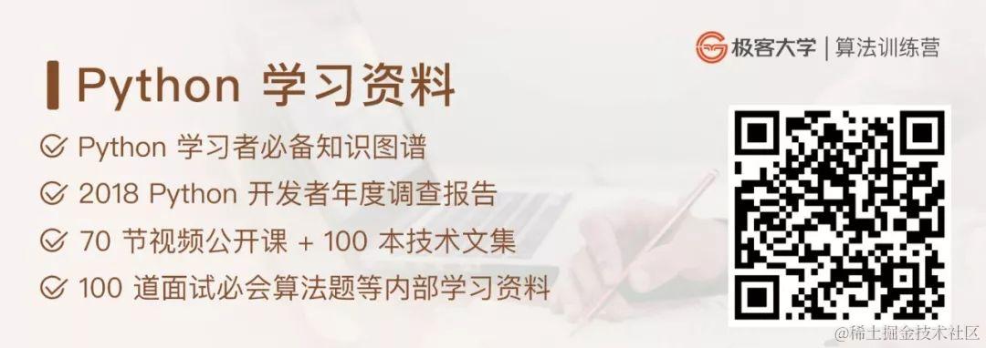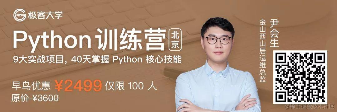 推荐给你尹会生与极客时间联合开设的 线下大课+线上直播 相结合的 「Python 进阶训练营」 ,面向 Python 初学者和初级 Python 工程师, 用 50 天时间实现 Python 开发技能的进阶和突破,成长为一名专业选手。
