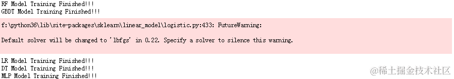 可以看到:我上面一共选择了五种模型分别是:随机森林模型、梯度提升决策树模型、逻辑回归模型、决策树模型和多层感知机神经网络模型。该阶段的输出如下: