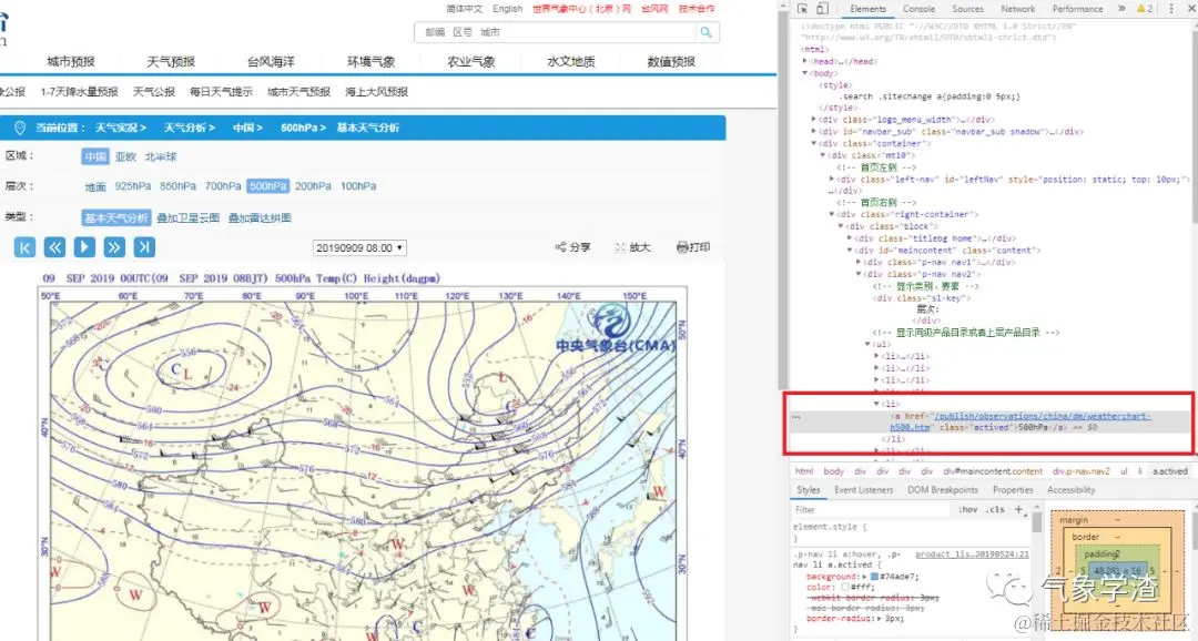 举个例子:我们移动鼠标到层次500hPa,就可以自动定位到500hPa层级按钮对应的HTML元素了,查看到它的属性,可以看到500hPa这个按钮对应的页面元素是link文字。