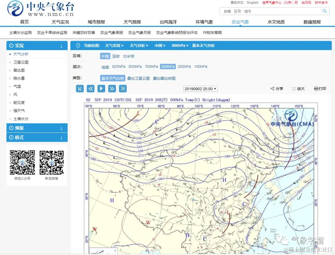假设我们想下载500hPa高度的基本天气分析图,在平时我们会怎么做?肯定是在页面上点击500hPa,选择基本天气分析,然后对图片右键另存为对不对?那么接下来我们就要借助Selenium对网页进行控制,爬取的过程也就是模拟上述一系列人为操作让机器来自动执行。\