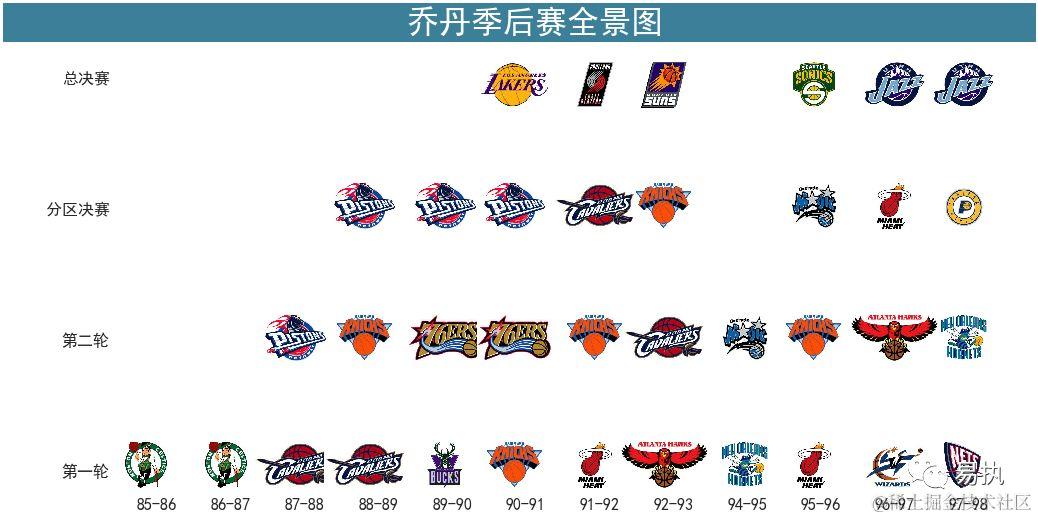 季后赛是巨星的舞台,也是检验一只球队的验金石,乔丹虽然得了6个总冠军,铸造了公牛王朝,但是在季后赛的旅途上也并不是一帆风顺,直到28岁才拿到了第一个总冠军,下面就通过数据,来回忆一下乔丹的季后赛之旅。