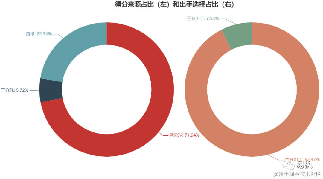 从两个圆环图中可以看出,乔丹更偏向于两分出手,整个职业生涯三分的出手数仅占7.53%,得分也主要来源于罚球和两分球,这和现在NBA的进攻风格形成了较大的差异,另一方面,这也体现出了老流氓的恐怖之处,靠着一手中投拿了10次NBA得分王,前无古人,后能不能有来者呢?