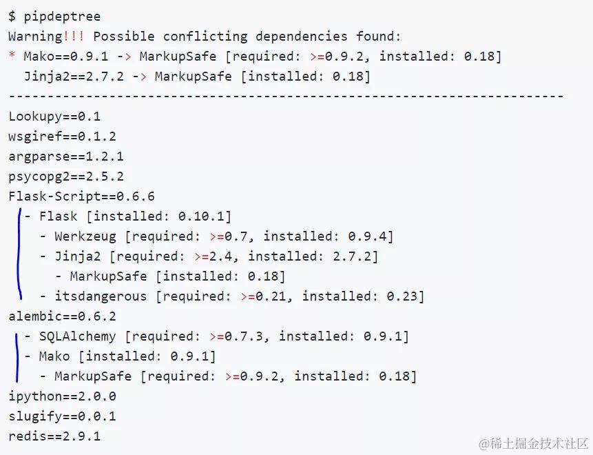 它的主要用途是展示 Python 项目的依赖树,通过有层次的缩进格式,显示它们的依赖关系,不像前面那些工具只会生成扁平的并列关系。