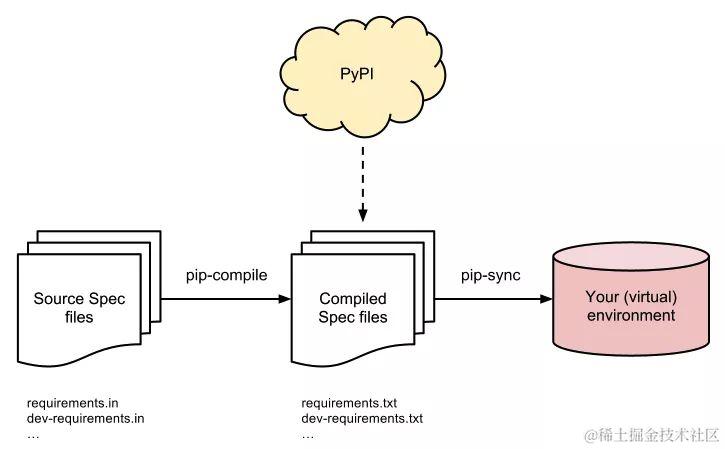 pip-compile 命令主要用于生成依赖文件和升级依赖库,另外它可以支持 pip 的“Hash-Checking Mode ”,并支持在一个依赖文件中嵌套其它的依赖文件(例如,在 requirements.in 文件内,可以用“-c requirements.txt”方式,引入一个依赖文件)。