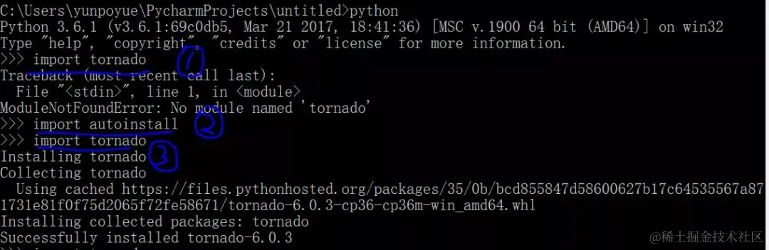 我们以 tornado 为例,第一步操作可看出,我们没有装过 tornado,经过第二步操作后,再次导入 tornado 时,程序会帮我们自动下载并安装好 tornado,所以不再报错。