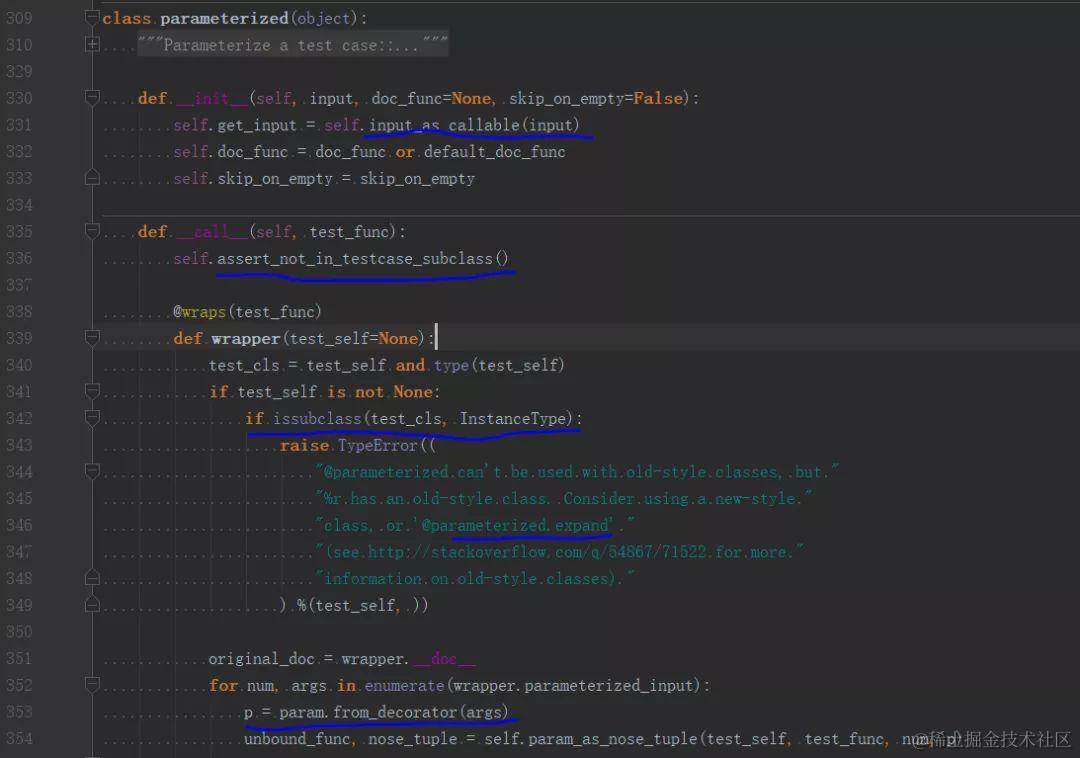 它提供了一个装饰器类 @parameterized,源码如下(版本 0.7.1),主要做了一些初始的校验和参数解析,并非我们关注的重点,略过。