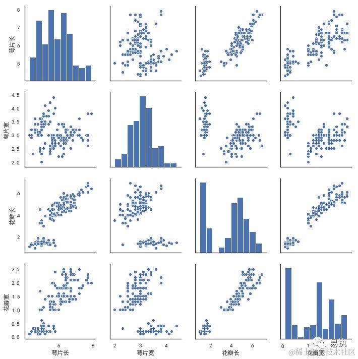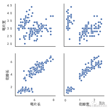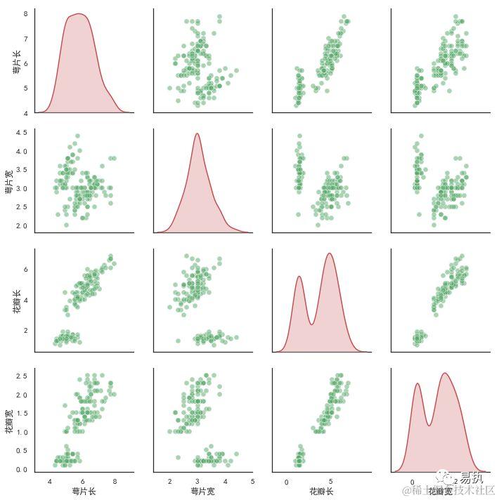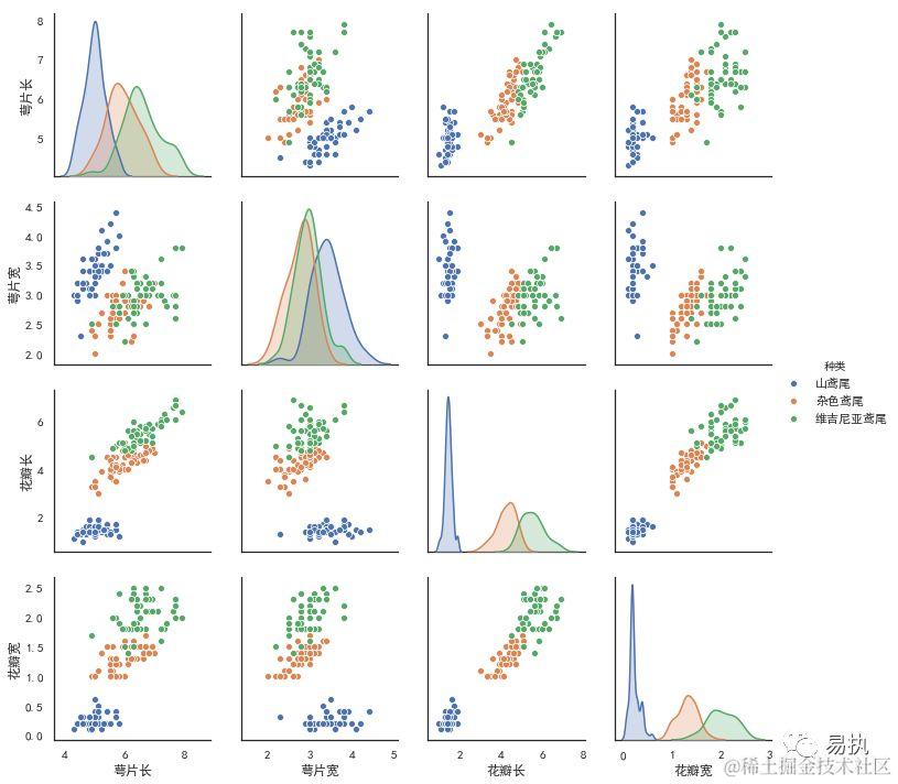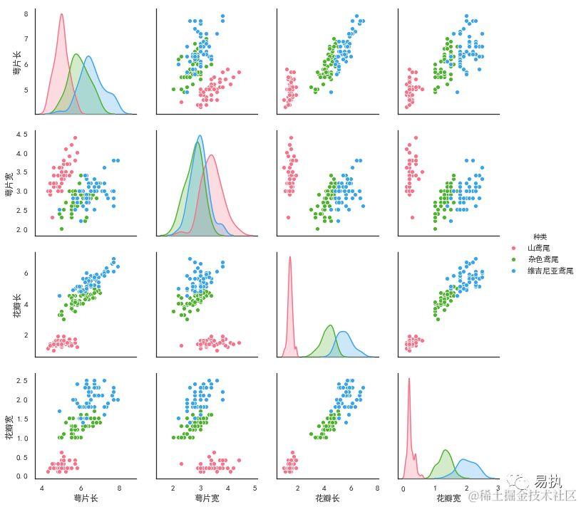 我们可以从经过hue分类后的pairplot中发现,不论是从对角线上的分布图还是从分类后的散点图,都可以看出对于不同种类的花,其萼片长、花瓣长、花瓣宽的分布差异较大,换句话说,这些属性是可以帮助我们去识别不同种类的花的。