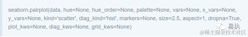 ****pairplot中pair是成对的意思,pairplot主要展现的是变量两两之间的关系(线性或非线性,有无较为明显的相关关系),照例来总览一下pairplot的API。
