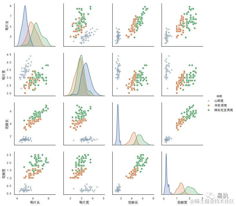 sns.pairplot(data,hue="种类",markers=["+", "s", "D"])