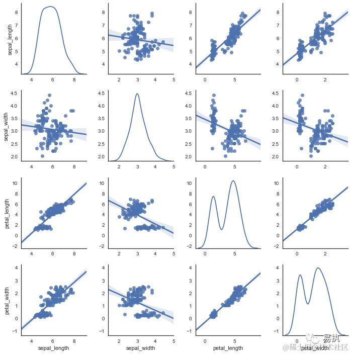kind:用于控制非对角线上的图的类型,可选"scatter"与`"reg"`````
