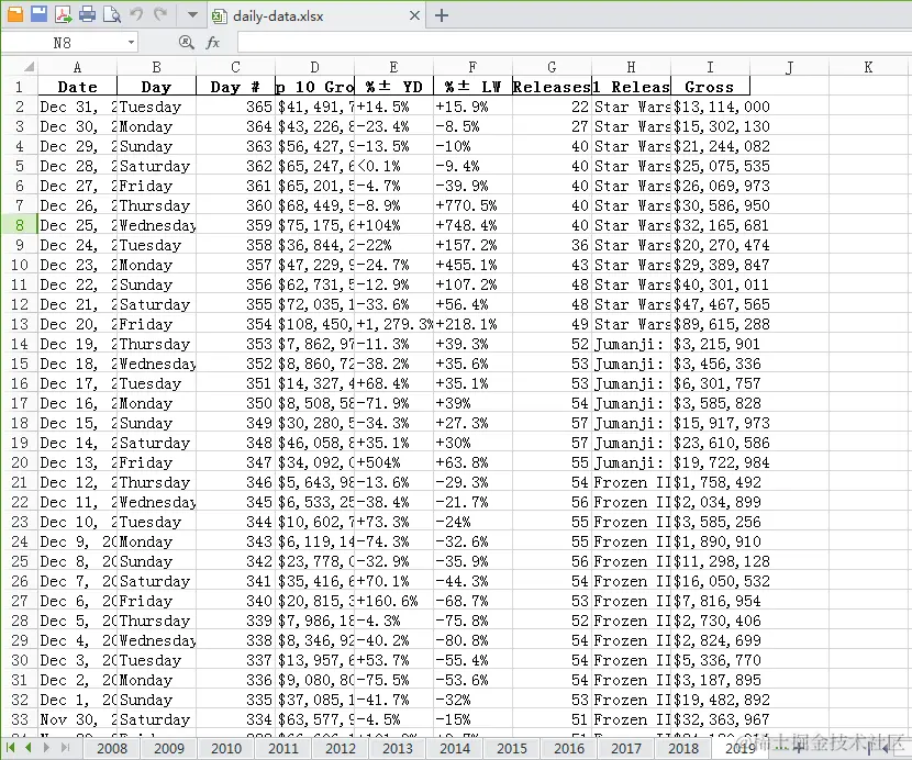fileLoc = r'C:\Users\leon\Desktop\BoxOffice\Box Office Mojo票房爬虫\Daily-每日\daily-data.xlsx'