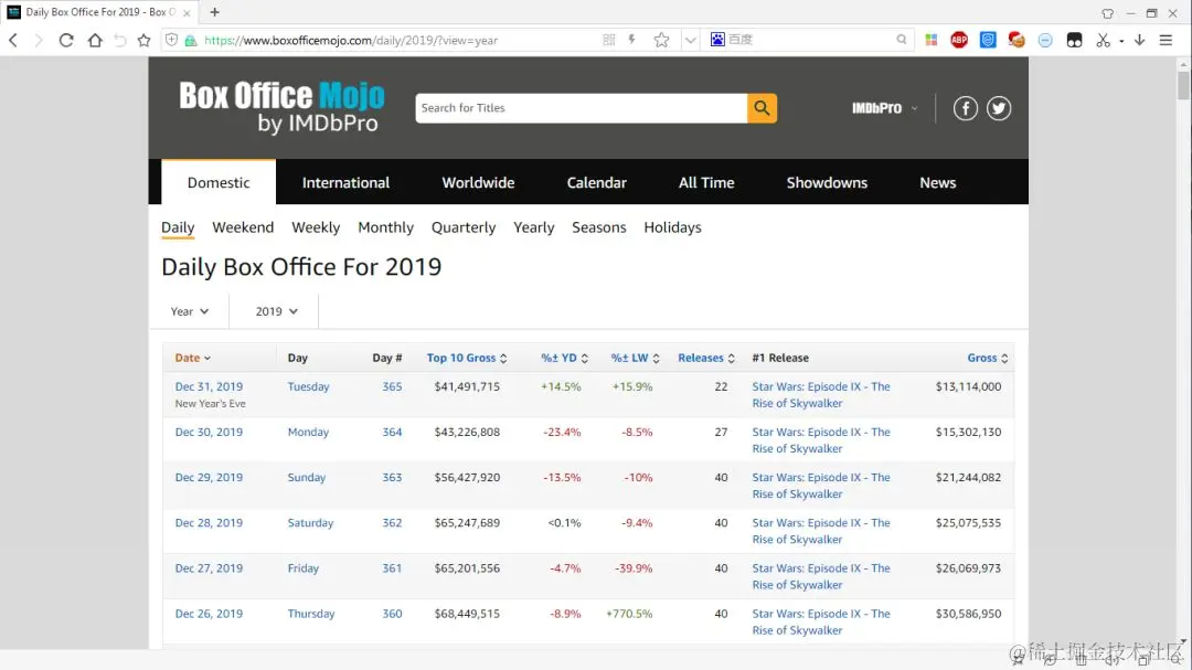 最近在处理一些和有关电影的工作,需要用到一些北美电影票房数据,而这部分数据最权威的网站当属Box Office Mojo(以下简称BOM),于是就上去查看了一下。估计经常关注这个网站的盆友们都知道,这个网站最近刚刚进行了改版,网页排版全面更新,还专门针对移动设备进行了优化(以前的网站页面只有电脑版的),页面虽然好看了不少,但却少了很多数据,之前的网站几乎所有数据都能查到,而现在则只能查到部分数据,有些数据则要到BOM Pro版才能查到,而这个服务是收费的。为了更好地使用数据,还想不花钱,那就只有自己动手丰衣足食,所以笔者就自己写了个Python爬虫,爬取了过去多年的票房数据。以下就以“北美票房每日票房数据”为例,介绍一下如何爬取,其他票房数据类似,只需修改少数代码即可。