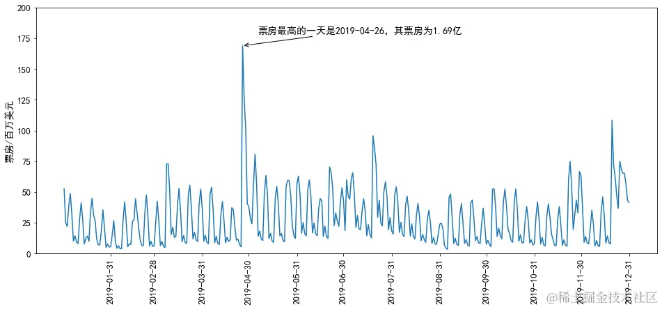 text = r'票房最高的一天是%s,其票房为%.2f亿' % (max_date.date(), max_y/100)