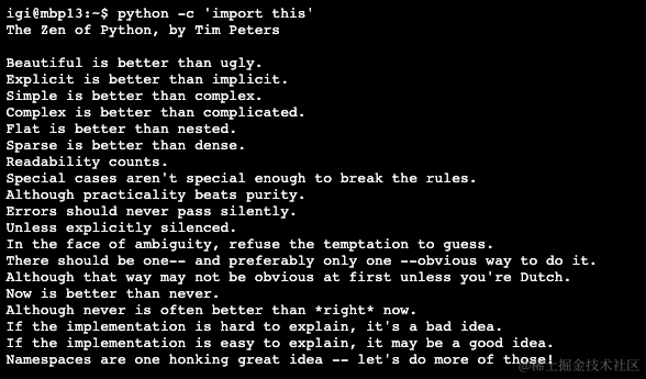 注: 《Python 之禅》是 2004 年的 Python 改进提案,编号为 PEP 20。以禅诗、偈颂的形式。