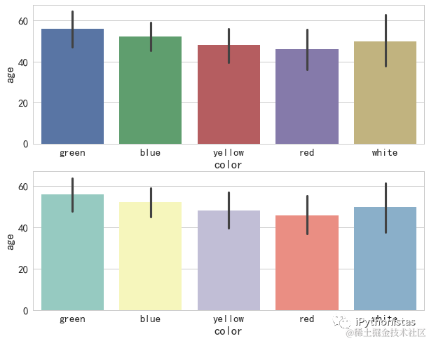 sns.barplot(x="color",y="age",data=data,ax=axes[0]) #上图