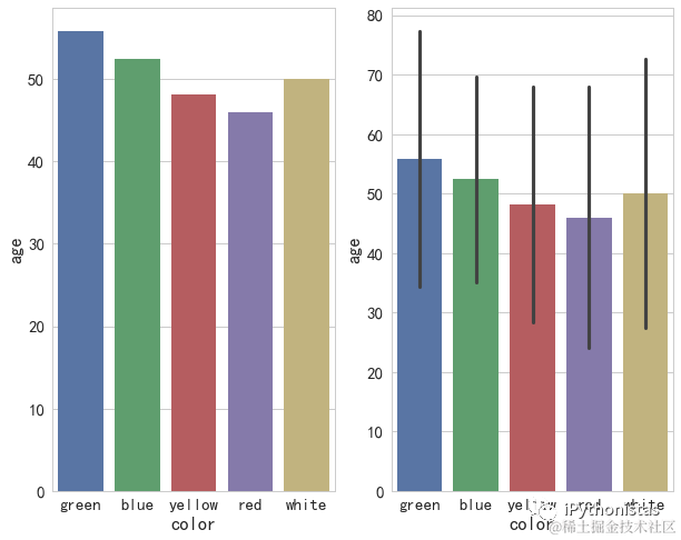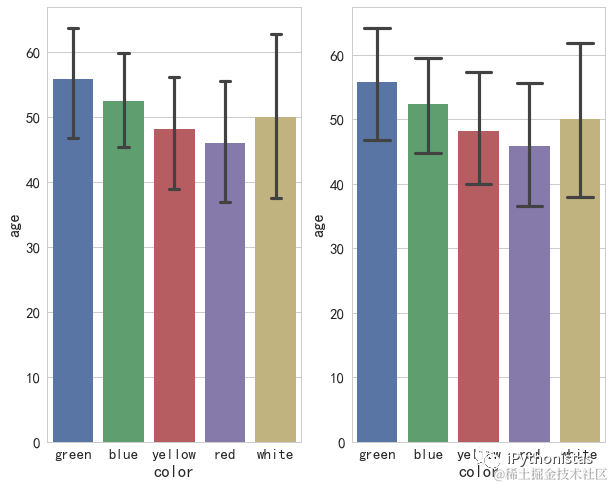 sns.barplot(x="color",y="age",data=data,ax=axes[1],capsize=.5) #右图