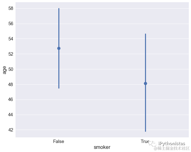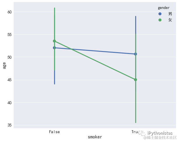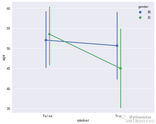 我们可以看到两个类别的误差棒重叠在了一起,使数据观测不清晰。怎么解决这个问题呢?pointplot的dodge参数可以使重叠的部分错开: