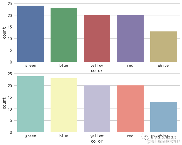 注:countplot参数和barplot基本差不多,可以对比着记忆,有一点不同的是countplot中不能同时输入x和y,且countplot没有误差棒。