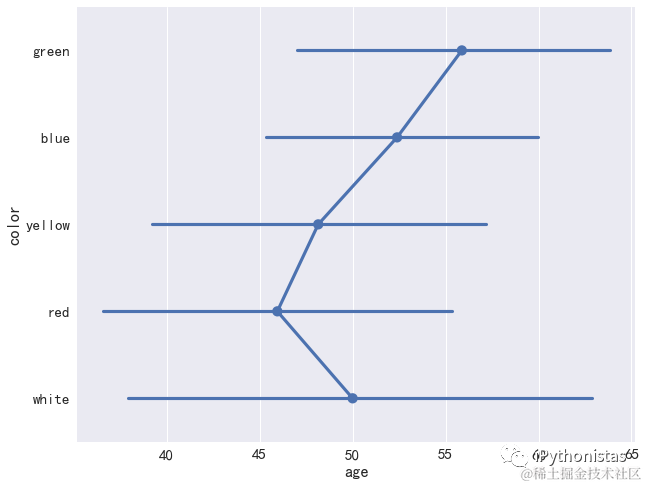 点图代表散点图位置的数值变量的中心趋势估计,并使用误差线提供关于该估计的不确定性的一些指示。点图可能比条形图更有用于聚焦一个或多个分类变量的不同级别之间的比较。他们尤其善于表现交互作用:一个分类变量的层次之间的关系如何在第二个分类变量的层次之间变化。连接来自相同色调等级的每个点的线允许交互作用通过斜率的差异进行判断,这比对几组点或条的高度比较容易。具体用法如下: