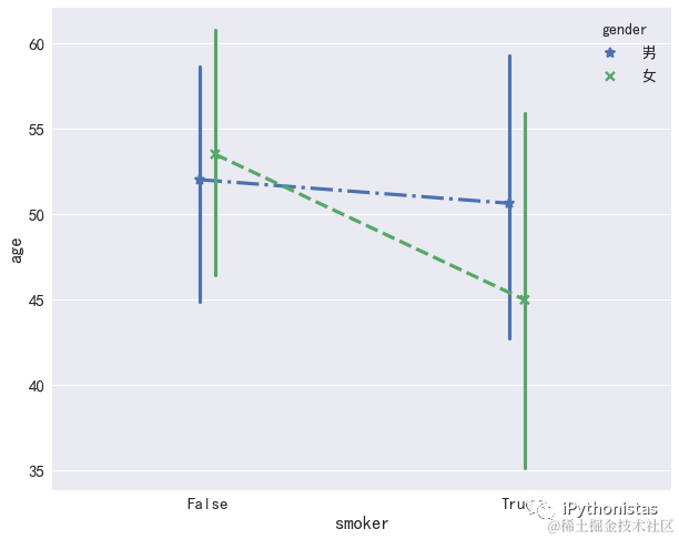 接下来我们对均值点的样式(由参数markers控制)和相同色调的点之间的连线(由参数linestyles控制)做一下改动。
