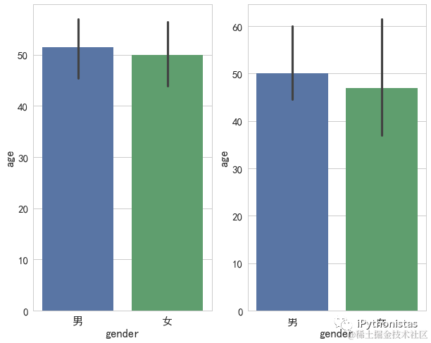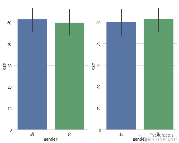 sns.barplot(x="gender",y="age",data=data,ax=axes[0]) #左图,默认为平均值