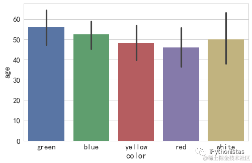 关于图像的解释:Seaborn会对”color“列中的数值进行归类后按照estimator参数的方法(默认为平均值)计算相应的值,计算出来的值就作为条形图所显示的值(条形图上的误差棒则表示各类的数值相对于条形图所显示的值的 误差)