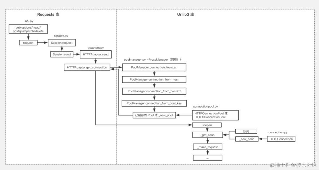 从之前的调用图和上述的源码可以看出,Pool 会调用 urlopen,其中通过 _get_conn 来获取一个 HTTPConnection,这个函数会优先从 Pool 自身的队列里面获取,如果有则直接返回;如果没有,则需要通过 _new_conn 重新创建一个(在处理结束后会 put 进队列)