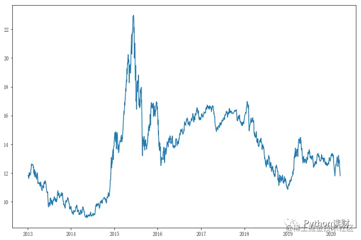 首先,准备我们需要的数据,一般来说,经历了一轮牛熊周期的历史估值更具比较意义,所以,这里以上证指数2013年到目前为止的行情数据为例进行演示,同时,采用滚动市盈率为估值指标。数据来源为tushare。