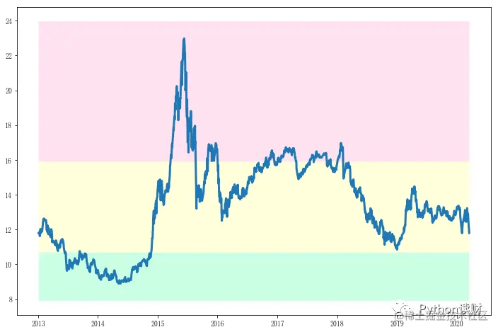 根据分割的数据点,就可以进行绘图了,这里主要用到fill_between函数绘制各区域的颜色分割,将高估区域用红色块填充,正常区间用黄色块填充,低估值区域用绿色块填充。同时为了显示效果,将图的上下限分别设置为最大值+1和最小值-1。