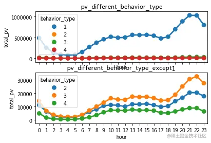sns.pointplot(x='hour',y='total_pv',hue='behavior_type',data=pv_detail\[pv_detail.behavior_type!=1],ax=axes\[1])