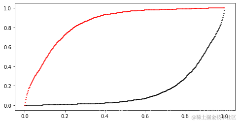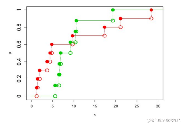 用同样的思想,我们可以检验**「两个样本是否服从同一分布」**,此时KS统计量 为两样本的经验分布函数的最大差值