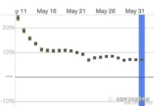 新颖效应是我们面临的另外一个难题。我们经常进行 A/B 测试,在早期对照组表现出正向的作用,并且逐渐趋向于中性。