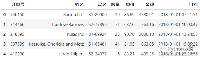 数据集中的特征有订单号、顾客姓名、商品名、数量、单价、金额以及对应的购买日期。