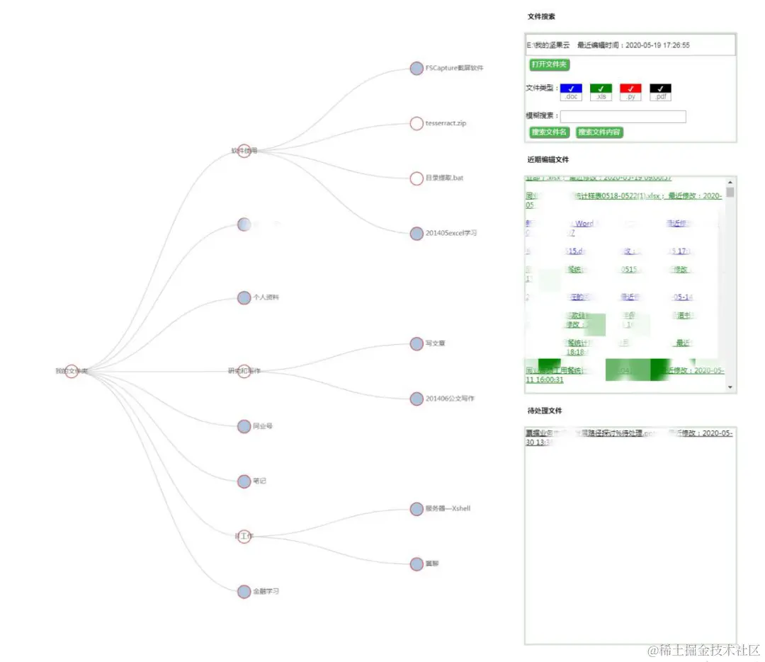 我这个程序的设想就是制作类似思维导图功能的工具,但最大优点是自动化,只要把这个工具放入所在文件夹中,就能根据文件夹结构生成图谱。还强化了文件夹的个性化操作功能。例如在某些文件夹或文件上标注“待处理”文字的话,能够将该文件名放置到待处理区域,提醒用户办理。整体界面如下: