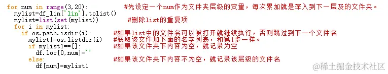 部分关键就是要写个循环,遍历到所有文件夹的最内层。用os.listdir获取文件名list,把文件名记录到一个dataframe,核心代码如下:
